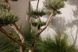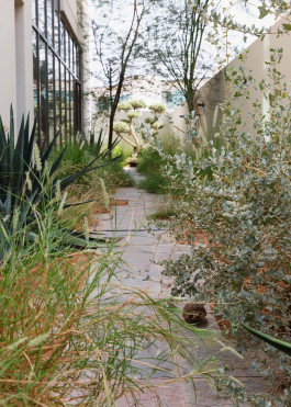 A passage of copper slate, reflective like a stream of water, leads to a snug atmospheric oasis of native grasses and shrubs, reigned over by majestic Olea europaea, a nod to the family’s Levantine origins and their love of sculpture.
